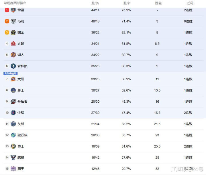 西部现在的局势,雷霆西部第1的位置在马刺的追赶下也有些岌岌可危,而马刺队之后,掘金、火箭、湖人,3队之间的胜负差只有 1场,在争夺着西部第3的位置!