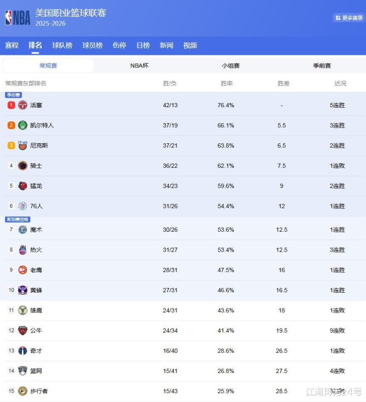 东部的竞争也很大,活塞稳坐第1,绿军也是霸占了第2的位置,而骑士队,则是战绩被尼克斯反超,掉到第4位!